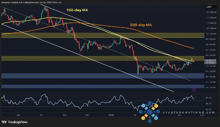 على مدى أشهر، كانت كل محاولة انتعاش على الرسم البياني اليومي تتجه مباشرة نحو المتوسط المتحرك لـ 100 يوم الهابط (الموجود حاليًا عند 75 ألف دولار تقريبًا) والحد العلوي للقناة الهابطة، ثم تلاشت. وتختلف المحاولة الحالية في جانب واحد مهم: حيث سجل مؤشر القوة النسبية قيعان أعلى منذ فبراير وهو بعيد عن منطقة ذروة الشراء. أدى هذا إلى بناء زخم تحت حركة السعر، مما أدى إلى اختراق فوق المتوسط المتحرك لـ 100 يوم والحد العلوي للقناة.