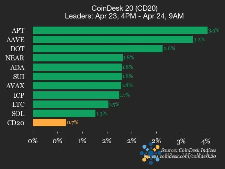 تحديث أداء CoinDesk 20: مكاسب Aptos (APT) بنسبة 3.5%، مما أدى إلى ارتفاع المؤشر