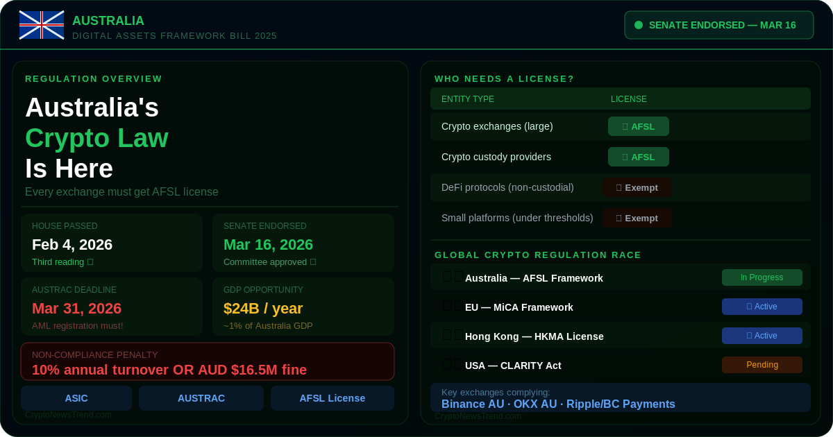 Australia Approves Crypto Licensing Framework Every Exchange Must Get AFSL License in 2026