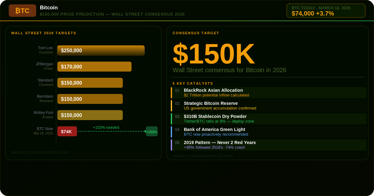 | Bull Target | $150,000 | Wall Street consensus for 2026 |
