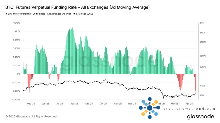 Despite the current sustained stretch of negative funding throughout March and April, bitcoin has continued to grind higher, climbing from the low to mid $60,000s to around $75,000.