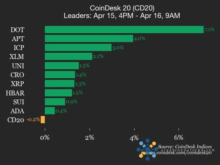 Leaders: DOT (+7.1%) and APT (+4.0%).Laggards: ETH (-1.3%) and AAVE (-1.1%).