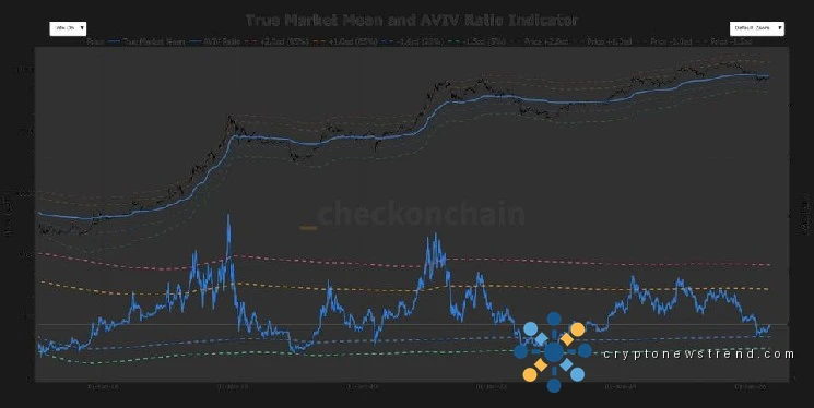Die erste Kennzahl ist der wahre Marktmittelwert, der derzeit bei 78.200 US-Dollar liegt. Diese von Checkonchain erfasste Kennzahl spiegelt den durchschnittlichen Anschaffungspreis des aktiv zirkulierenden Angebots wider, ausgenommen verlorene oder ruhende Münzen. Es erfasst effektiv die Gesamtkostenbasis der engagierten Marktteilnehmer.