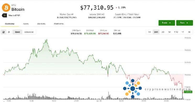 Der Kryptomarkt fiel am Donnerstag, wobei Bitcoin seit Mitternacht UTC 0,7 % verlor und kürzlich bei 77.600 $ gehandelt wurde.