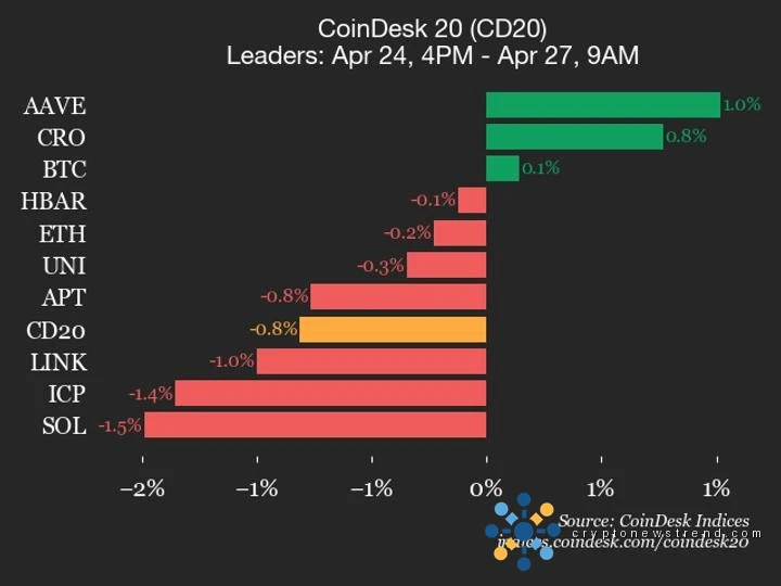 Spitzenreiter: AAVE (+1,0 %) und CRO (+0,8 %). Nachzügler: XLM (-3,4 %) und NEAR (-2,9 %).