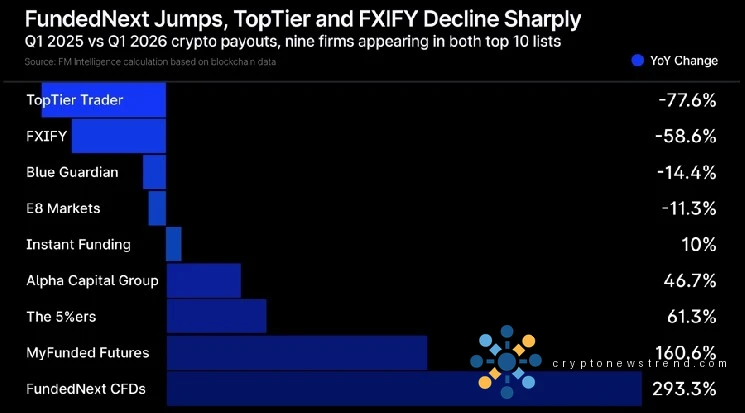 Innerhalb der Kohorte war die Wachstumsverteilung ungleichmäßig. FundedNext CFDs stiegen im Jahresvergleich um 293 % auf 42,7 Millionen US-Dollar, während MyFunded Futures um 161 % auf 38,5 Millionen US-Dollar stiegen. Zusammen repräsentierten die beiden Unternehmen 70,5 % der im ersten Quartal 2026 erfassten Auszahlungen in den Top 10. Sechs weitere Betreiber gingen in die andere Richtung: TopTier Trader verlor 78 %, FXIFY verlor 59 % und Blue Guardian und E8 Markets verzeichneten jeweils zweistellige Rückgänge.