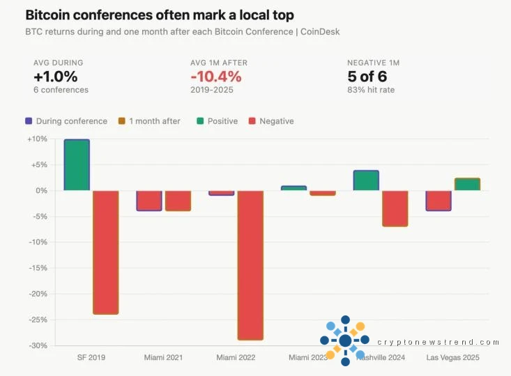Los datos de Galaxy Research e Investing.com que abarcan de 2019 a 2025 muestran que el precio de bitcoin tiende a aumentar en el período previo a estas conferencias, ofrece un desempeño mixto durante el evento y cae sustancialmente después.
