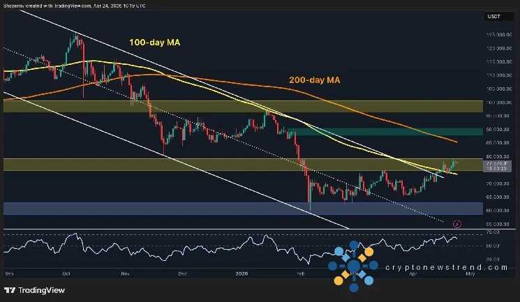 El canal descendente que definió la estructura de Bitcoin desde octubre de 2025 hasta principios de abril ahora está firmemente detrás del precio. La criptomoneda superó esa cifra, superó el promedio móvil de 100 días (~74 000 dólares) y se mantiene dentro de la banda de resistencia de 75 000 a 80 000 dólares, con el RSI con una tendencia alcista de alrededor de 60.
