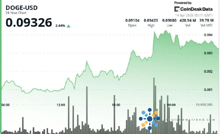 Una revisión de la acción del precio revela que Dogecoin subió de $0,091 a $0,0936, rompiendo efectivamente un estrecho rango de consolidación que se había centrado en $0,0915. El movimiento alcista fue impulsado por una actividad de compra persistente, que llevó a la formación de mínimos más altos a lo largo de la sesión de negociación. Aunque el precio tocó brevemente los 0,094 dólares, no logró superar este nivel de manera decisiva y, en cambio, se consolidó justo por debajo de la zona de resistencia.