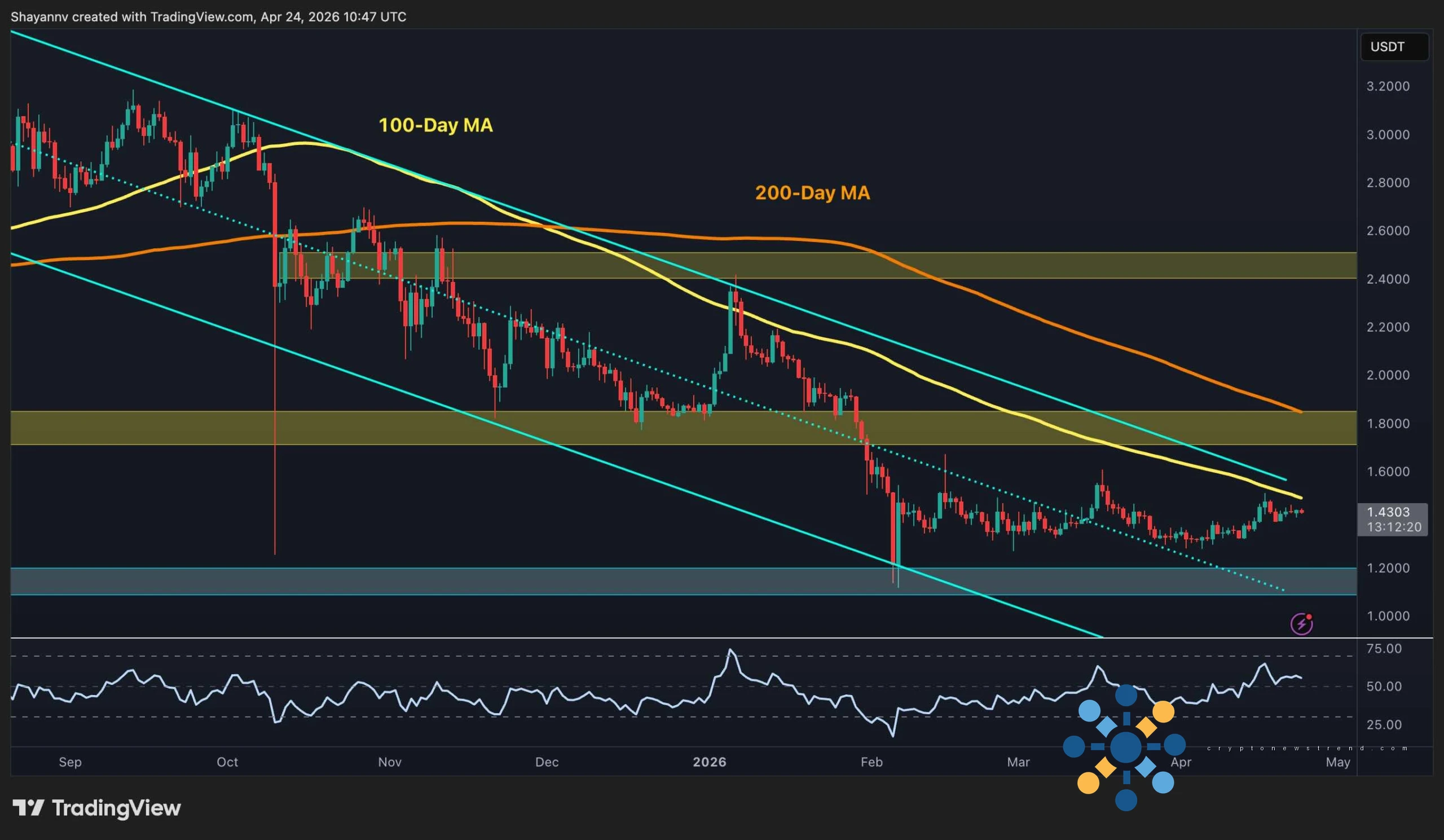 El canal descendente que ha contenido el $XRP desde los máximos de finales de 2025 permanece intacto, y la distancia entre el precio actual y cualquier resistencia significativa continúa haciendo que la tesis de la recuperación sea difícil de argumentar. El promedio móvil de 100 días ahora ha disminuido a aproximadamente 1,50 dólares, y el promedio móvil de 200 días se sitúa cerca de 1,80 dólares.