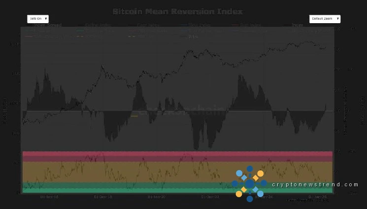 Vérifiez l'indice Bitcoin Mean Reversion, un modèle composite qui fait la moyenne de plusieurs mesures de valorisation clés, notamment la moyenne mobile sur 200 semaines, le prix réalisé, la tendance de la loi de puissance et un certain nombre de mesures de prix moyen pondérées en fonction du volume. L’indice classe le prix du Bitcoin sur une base centile historique.