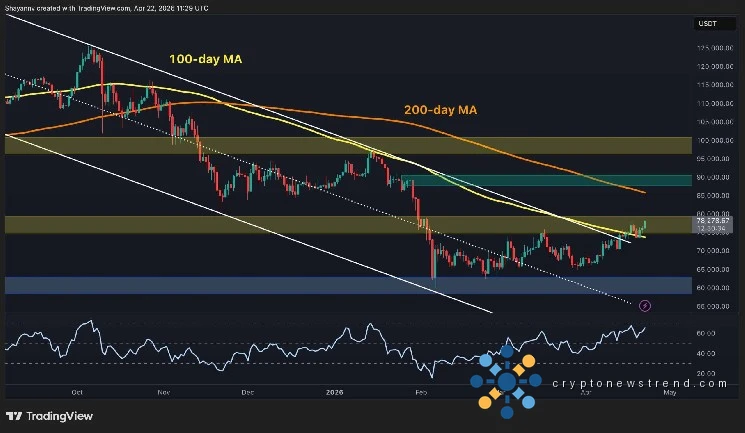 Следующее серьезное испытание произойдет в зоне $85–90 тыс., где сходятся нисходящая 200-дневная скользящая средняя и значительный кластер предложения. Недельное закрытие выше психологического уровня в 80 тысяч долларов станет очень важным структурным событием, поскольку оно подтвердит, что доминирующий тренд коррекции сломался. С другой стороны, бывшая граница канала и 100-дневная скользящая средняя около $75 тыс. теперь являются первыми уровнями поддержки, которые можно защитить при любом откате.