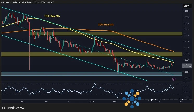 Полоса предложения в $1,80 выше 100-дневной MA остается первым уровнем, который действительно может изменить повествование, но для достижения этого уровня необходимо очистить скользящую среднюю и верхнюю границу канала. Ниже зона спроса в 1,20 доллара — единственное, что стоит между текущей ценой и психологическим и структурным прорывом к 1,00 доллара.