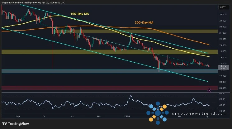 $XRP/$USDT چارٹ پر، $XRP تقریباً $1.32 ٹریڈ کر رہا ہے، جو کہ پچھلے کچھ مہینوں میں $1.20 سپورٹ زون سے اوپر ہے۔ دریں اثنا، RSI 50 کی سطح سے نیچے گر گیا ہے، جو اس بات کی نشاندہی کرتا ہے کہ رفتار اب بھی مندی ہے۔ اثاثہ بھی اب بھی 100-دن اور 200-دن کی حرکت پذیری اوسط دونوں کے نیچے ہے، جو بالترتیب $1.60 اور $2.00 کے نشانات کے ارد گرد واقع ہے۔