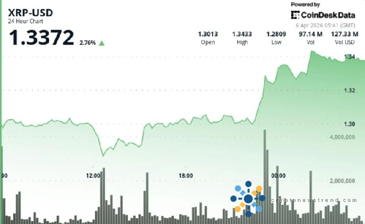 交易期间,XRP 价格从大约 1.29 美元上涨至 1.33 美元,全天保持小幅上涨。
